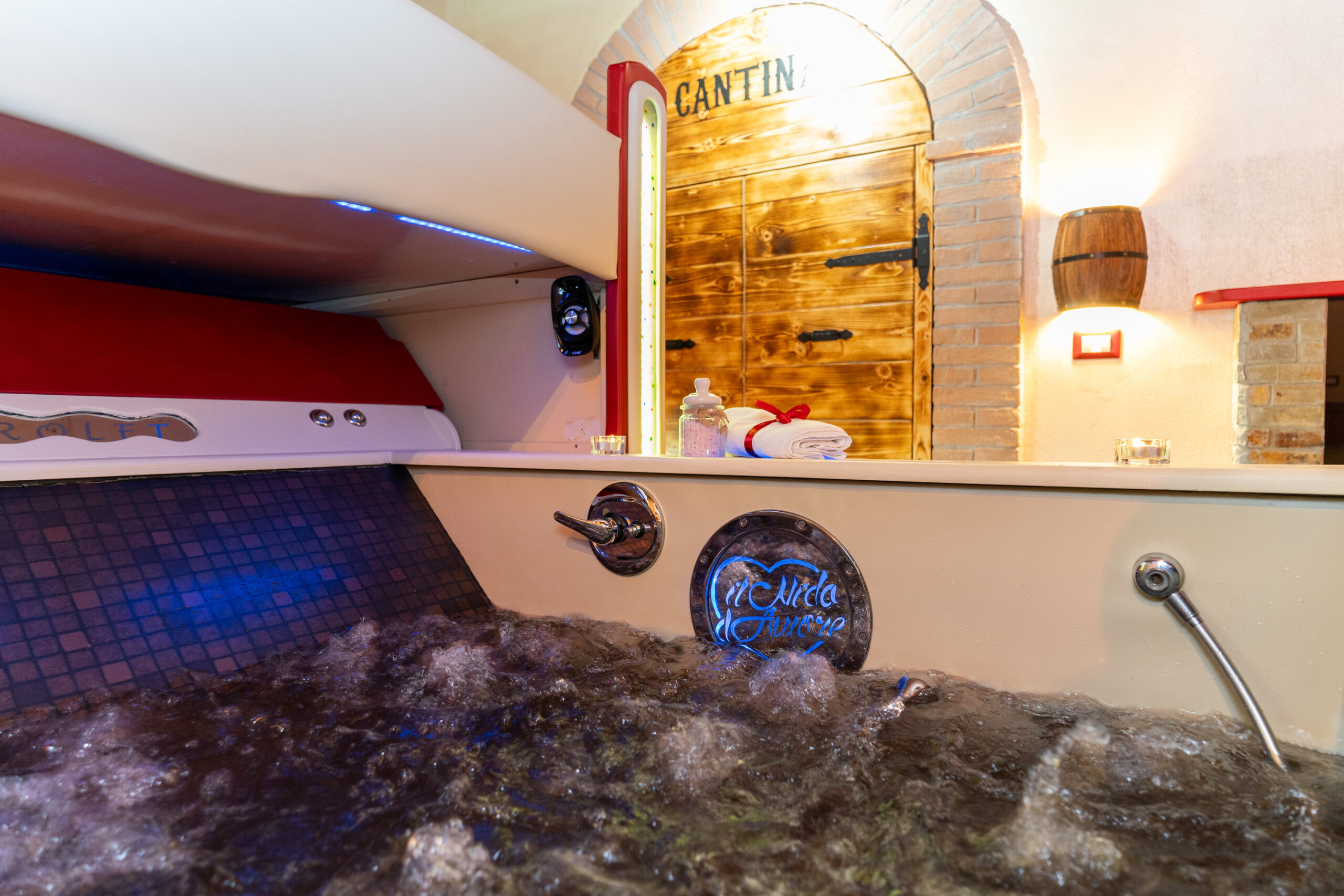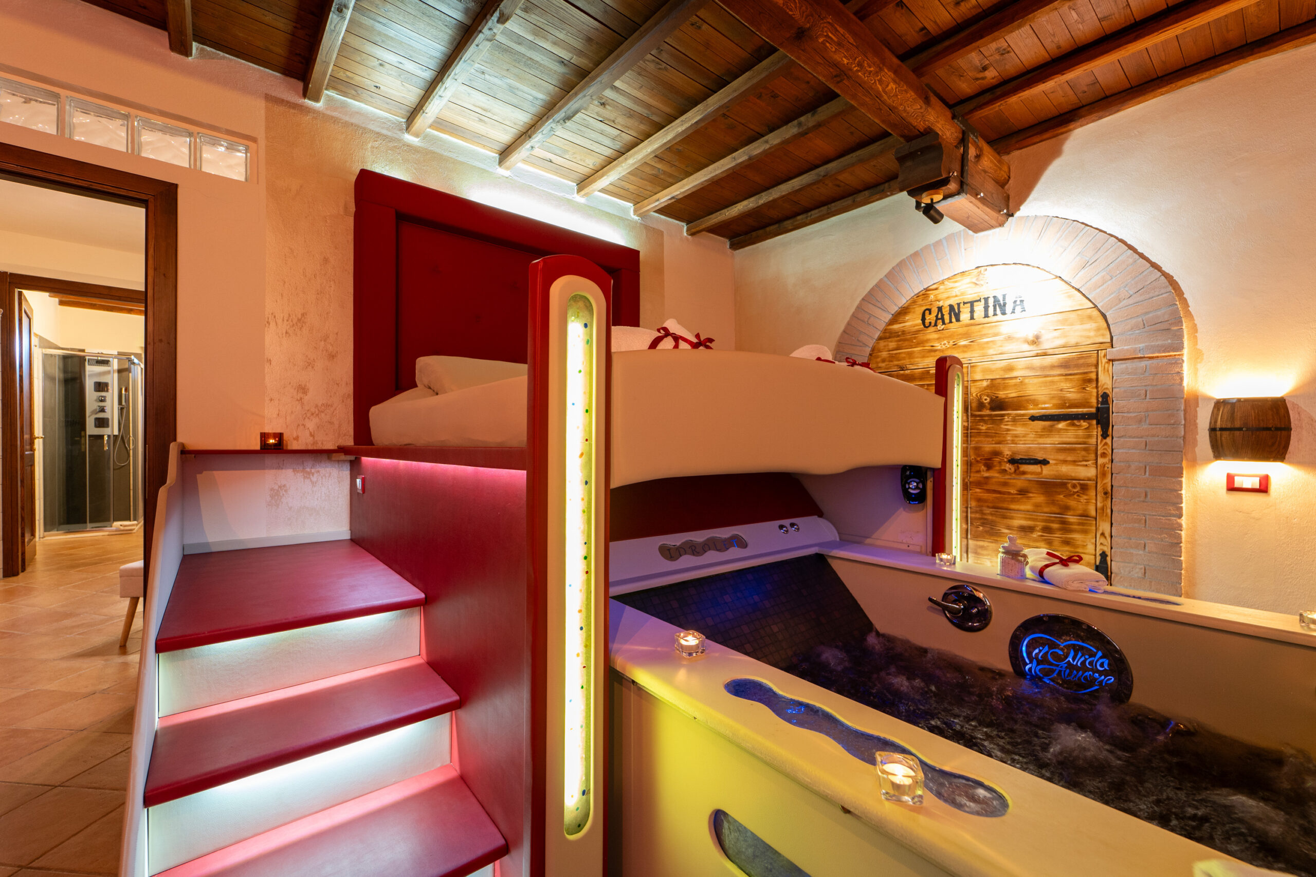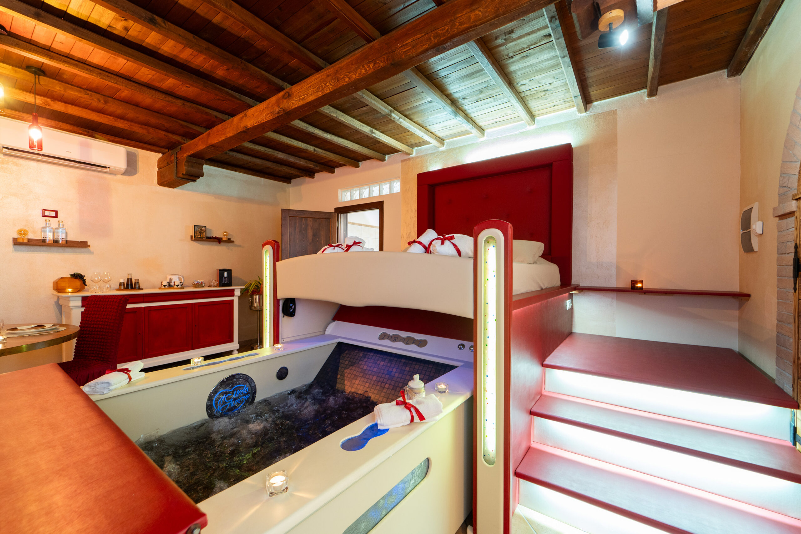 La Junior Suite “Bacco & Arianna” è una camera di 35mq. composta da camera matrimoniale con vasca idromassaggio a scomparsa sotto il letto matrimoniale studiata per il benessere di coppia.