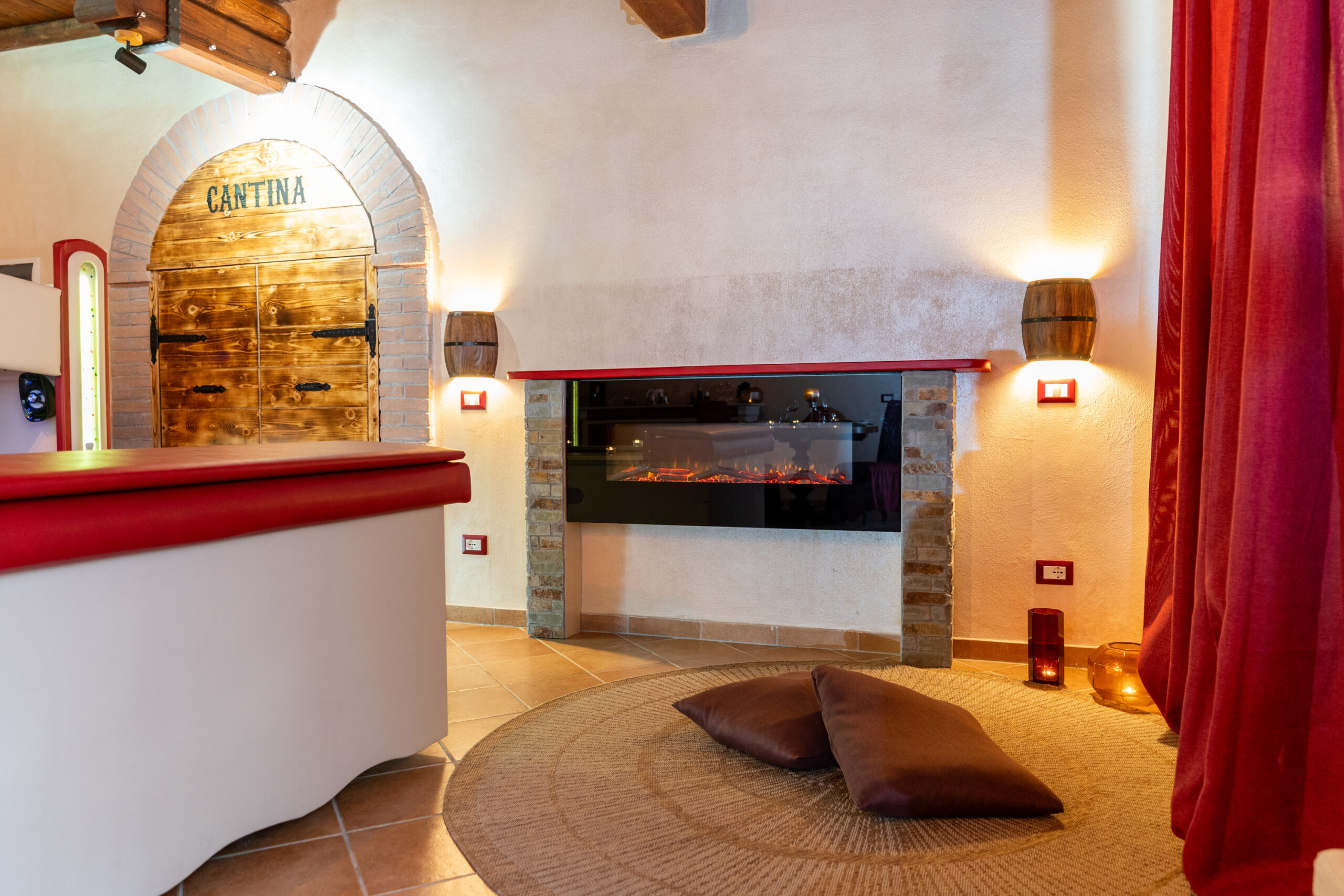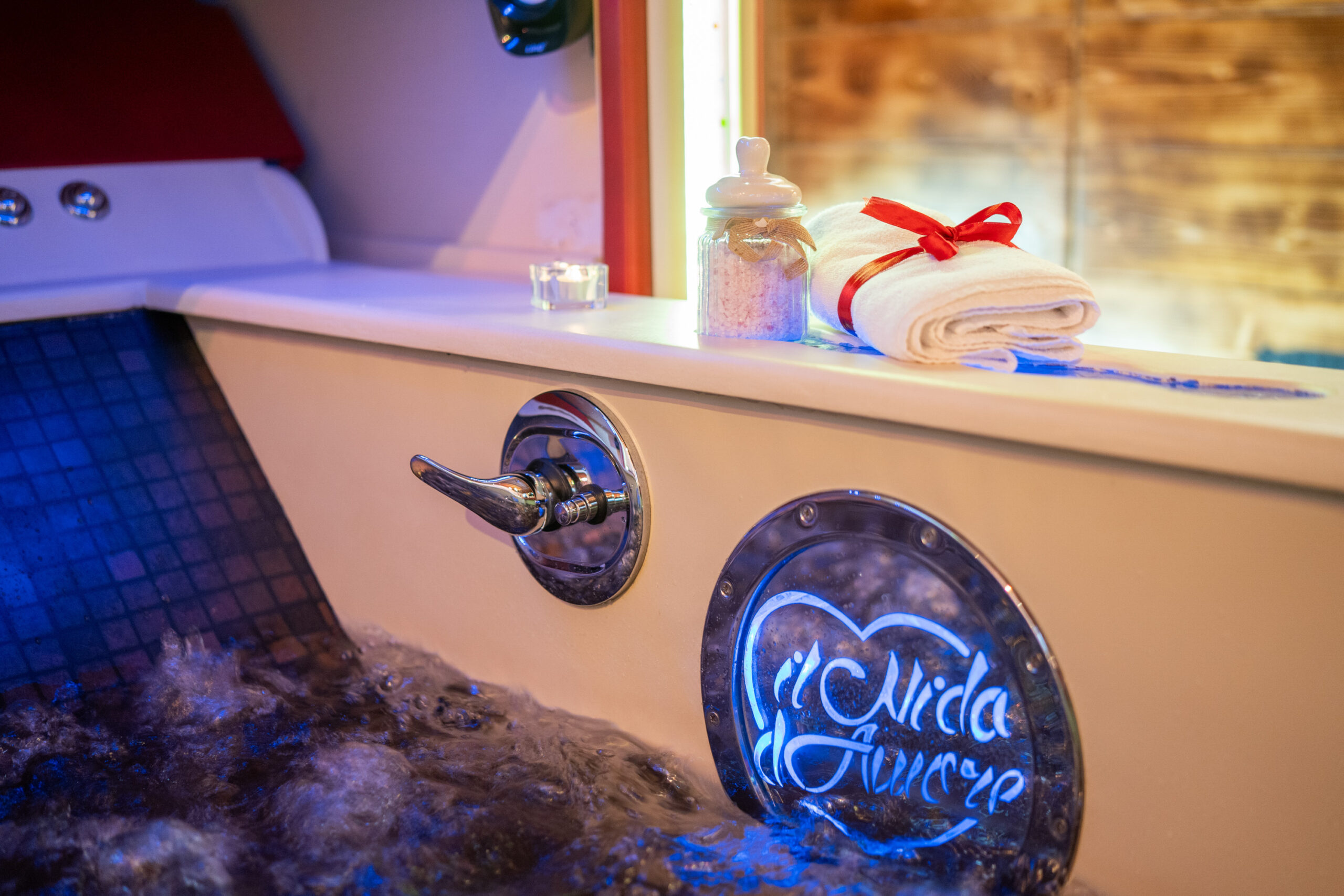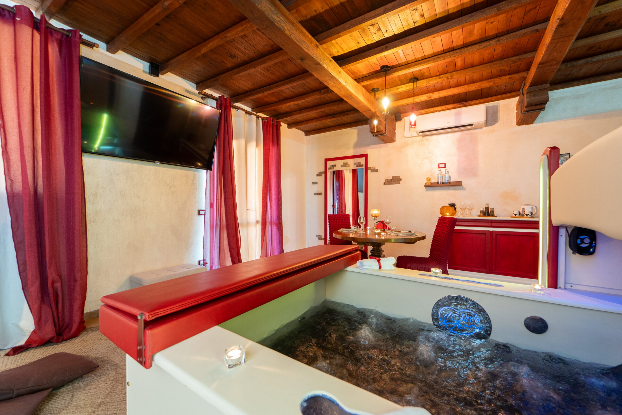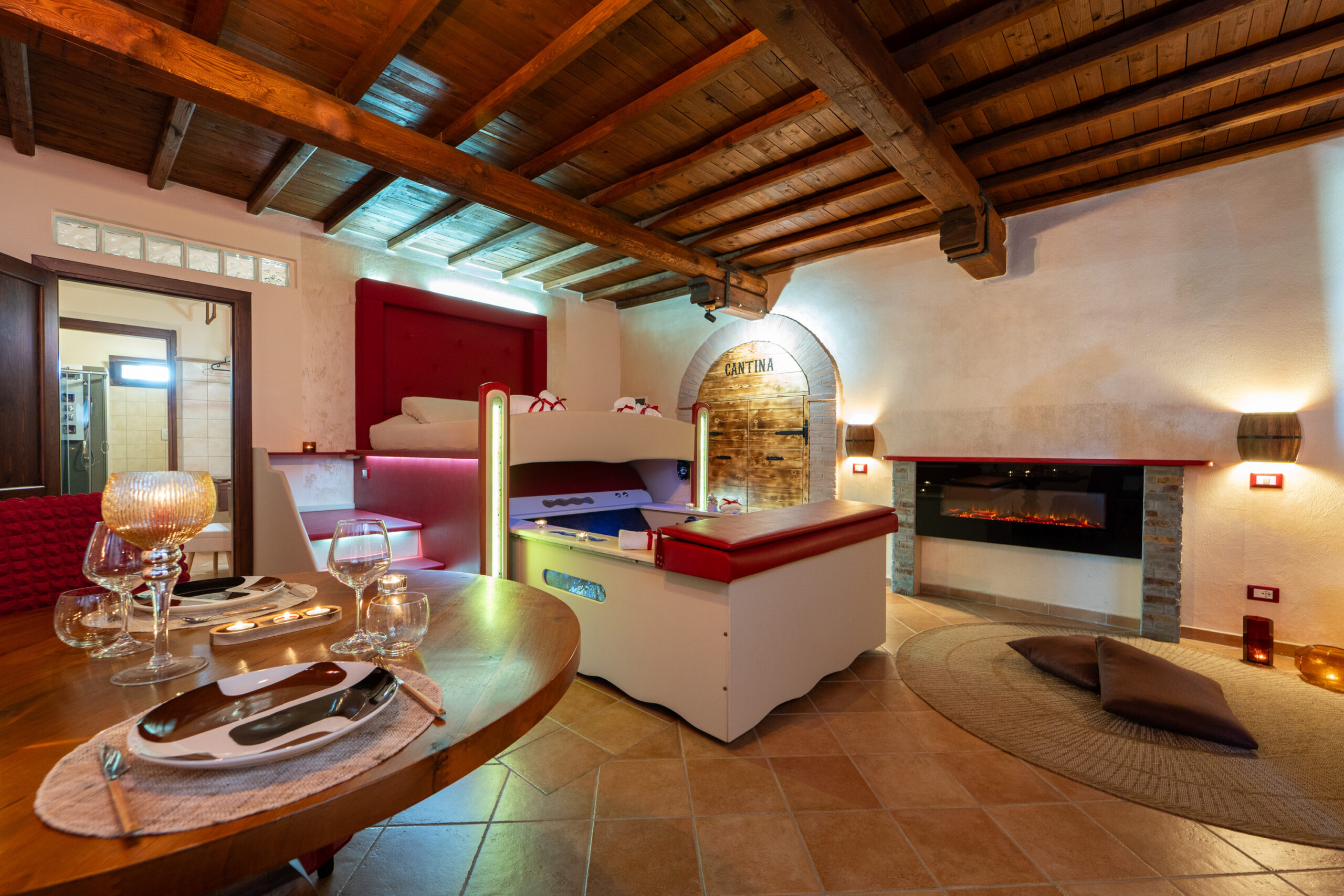 La Junior Suite “Bacco & Arianna” è una camera di 35mq. composta da camera matrimoniale con vasca idromassaggio a scomparsa sotto il letto matrimoniale studiata per il benessere di coppia.