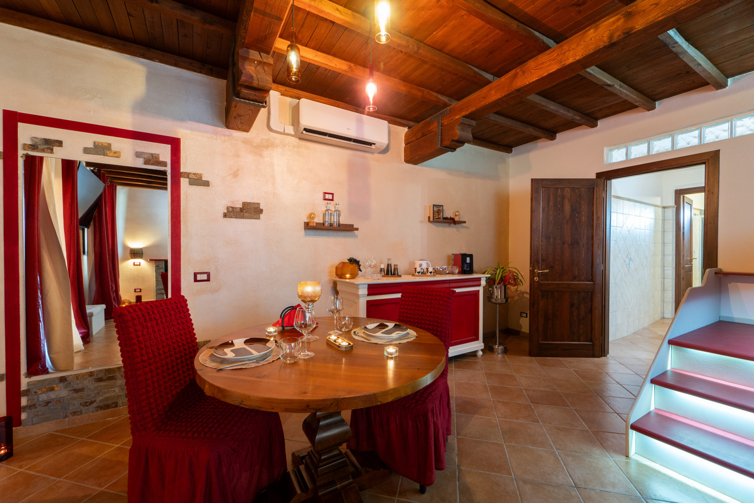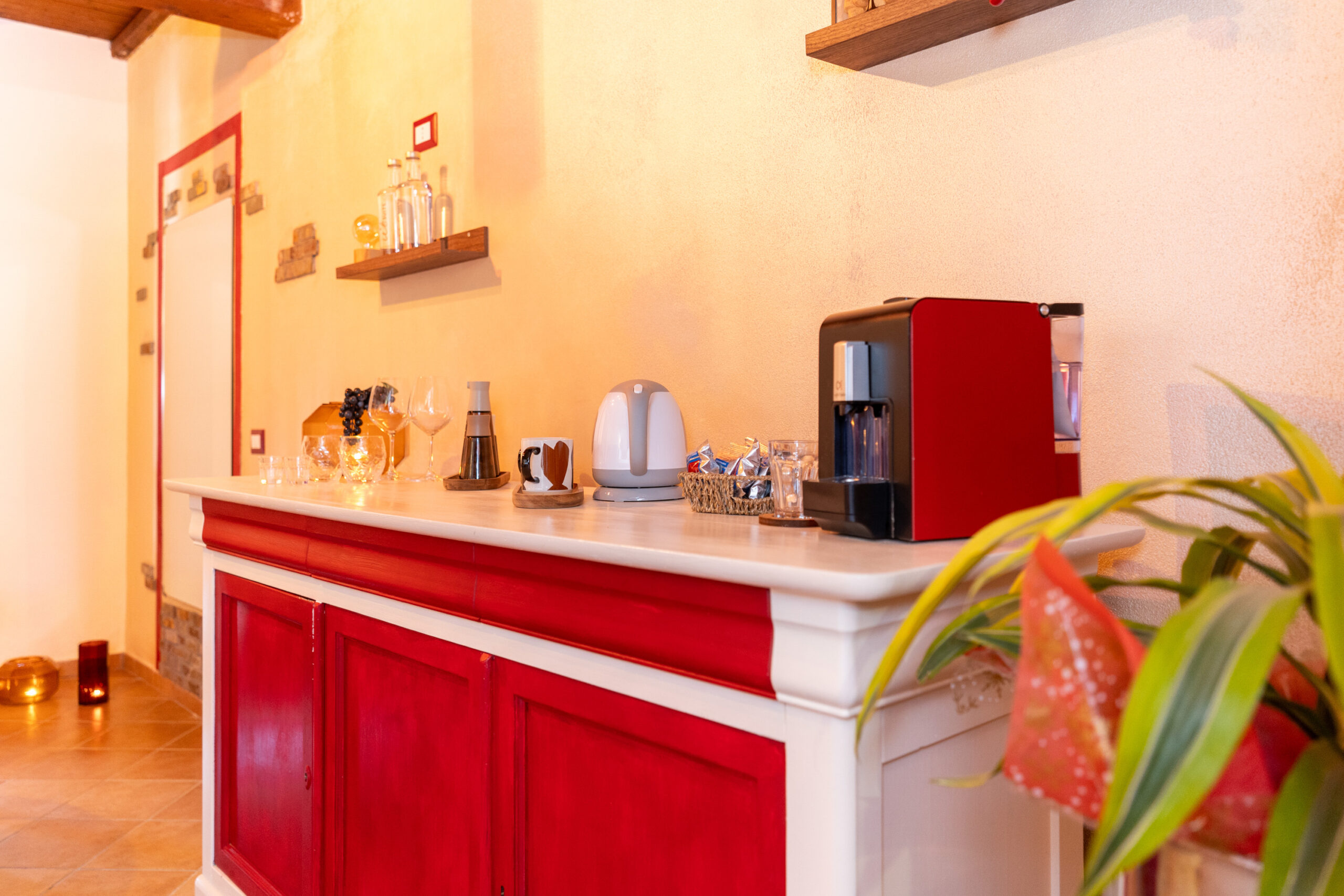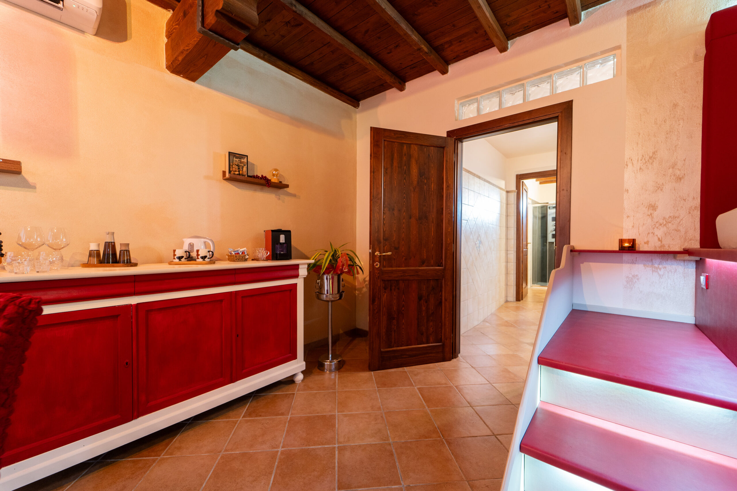 La camera dispone anche di tavolo per degustare romantiche cene per due persone al lume di candela e angolo snack bar con macchina del caffè, bollitore e bagno.