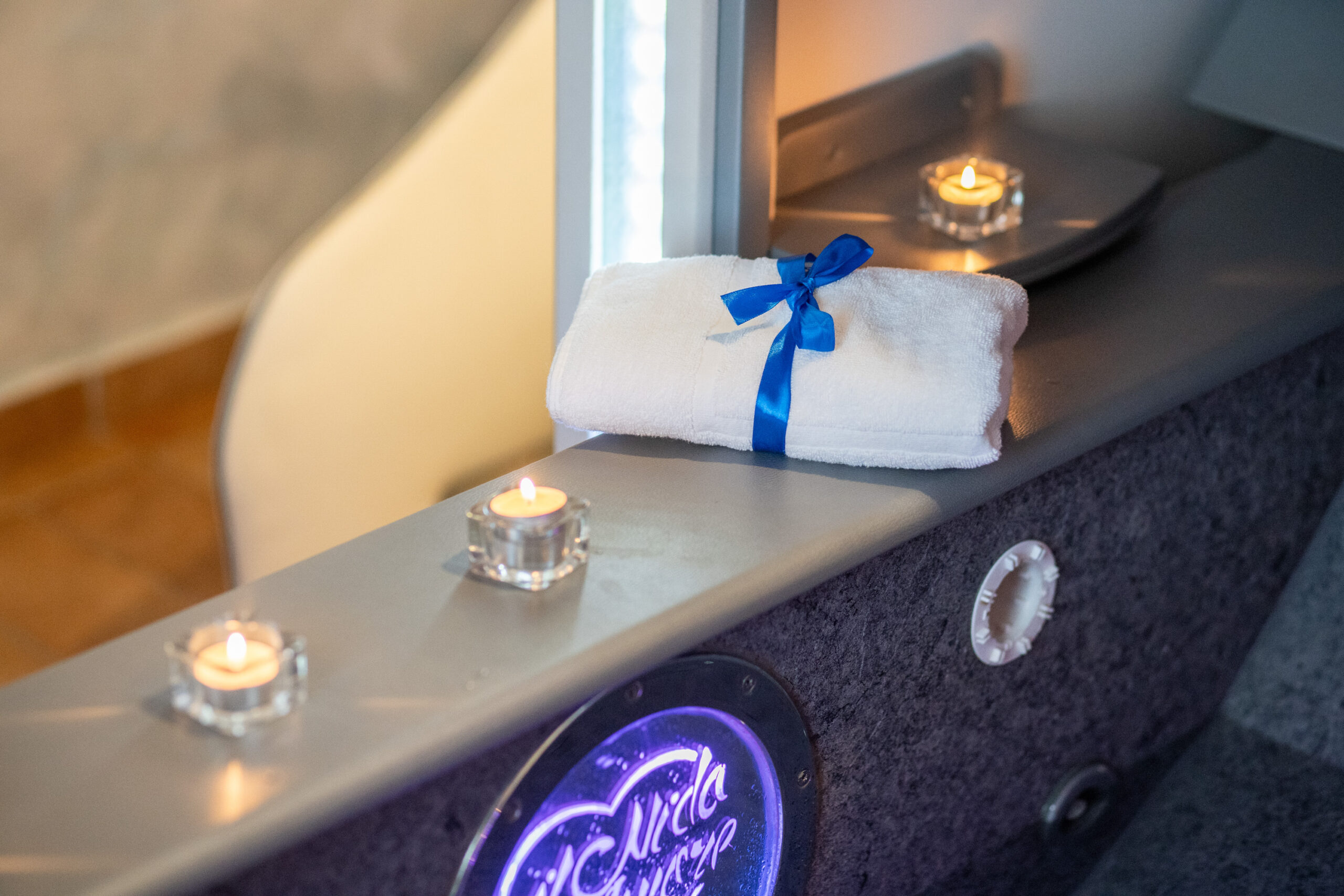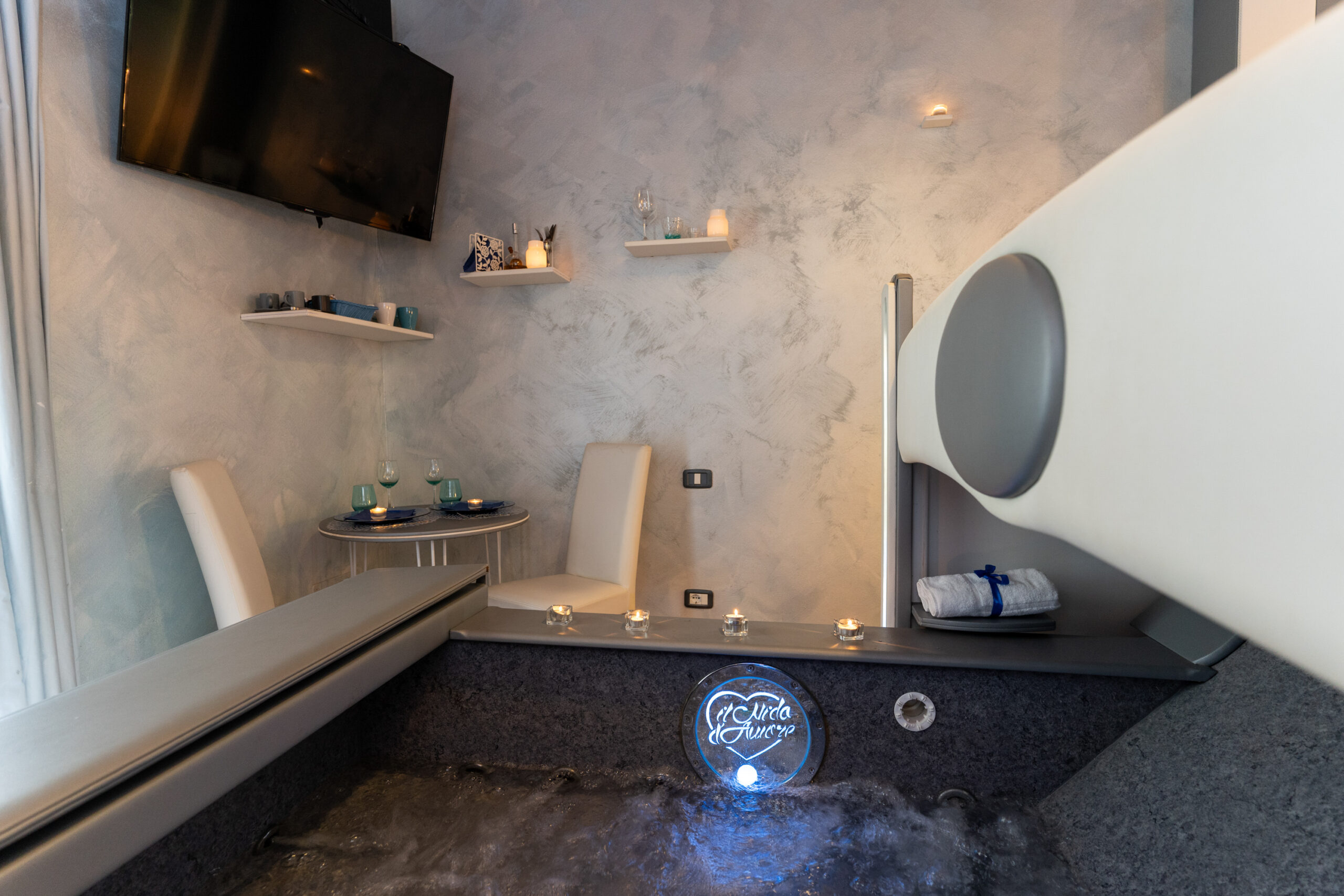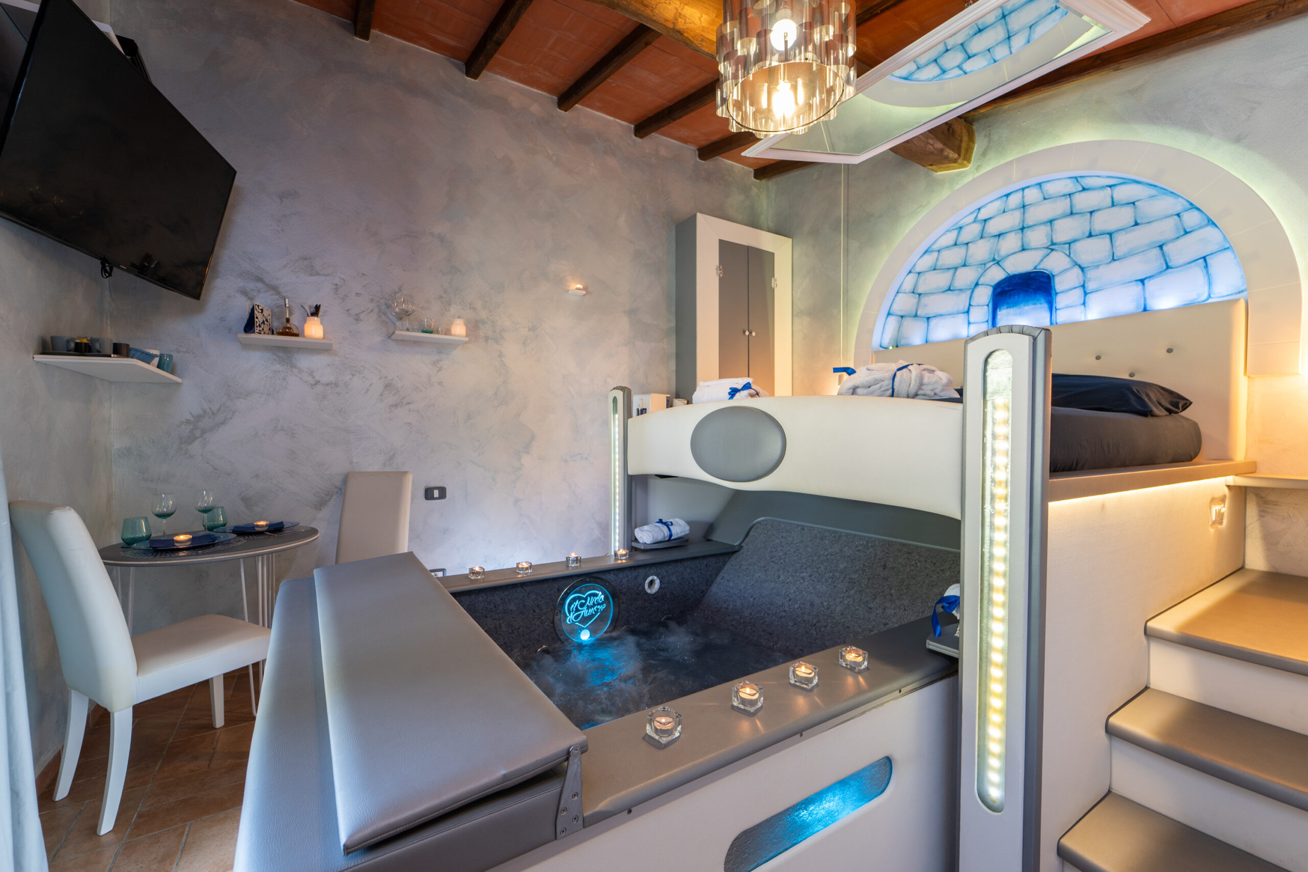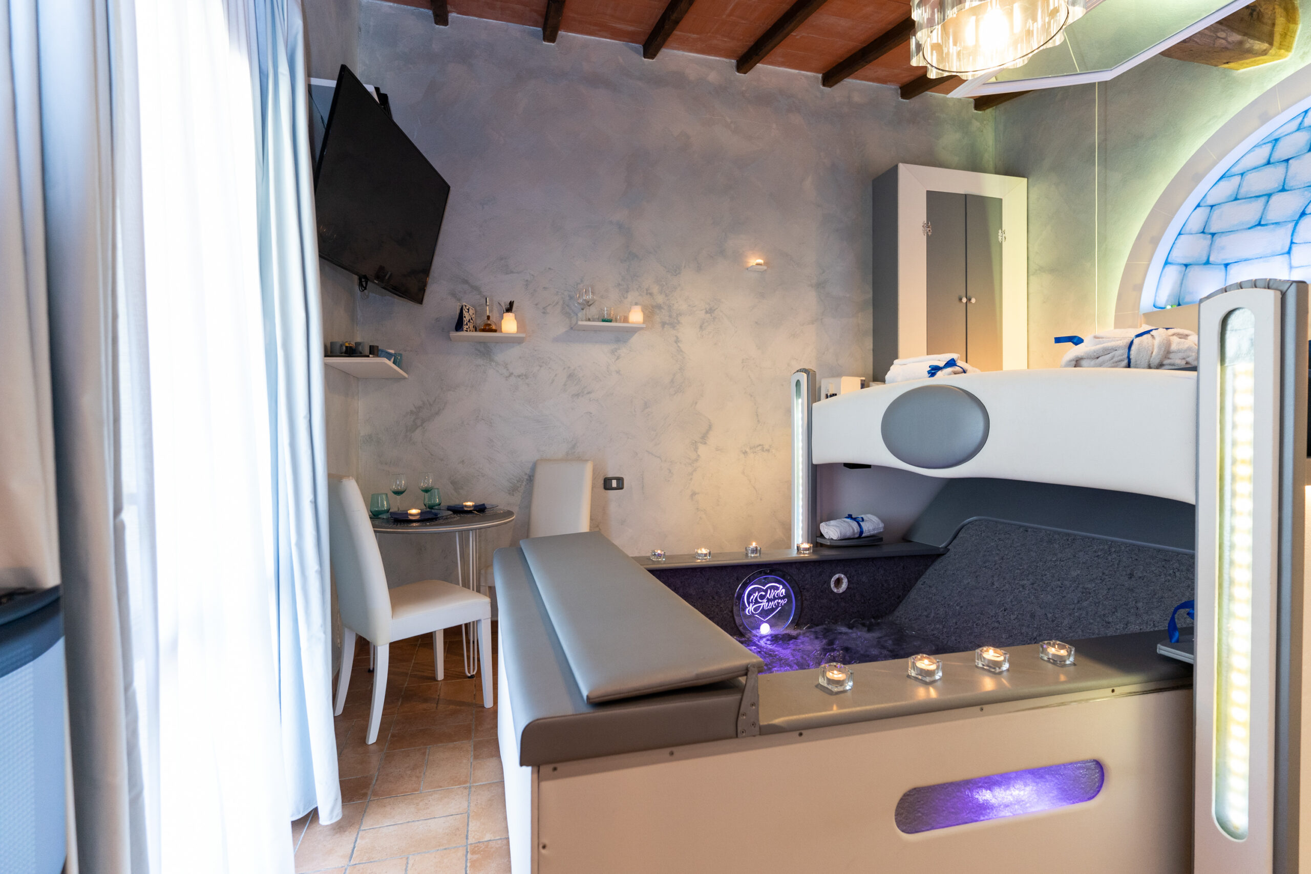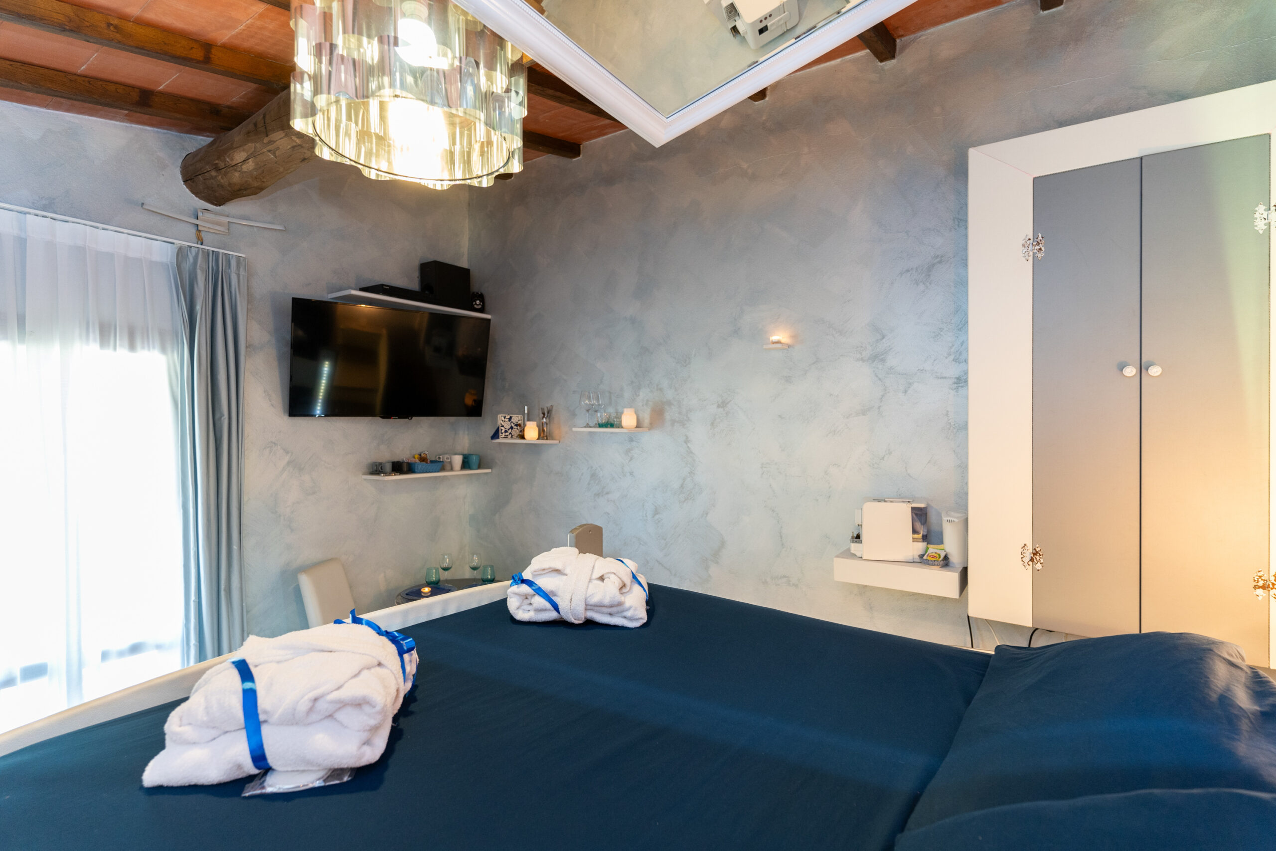 La camera è dotata di letto matrimoniale con vasca idromassaggio a scomparsa sotto il letto studiata per il benessere di coppia;